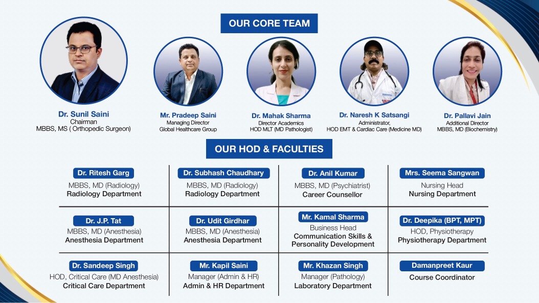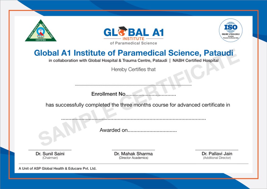 Global A1 Institute of Paramedical Science, Pataudi is a premier institute committed to shaping skilled and confident healthcare professionals. We are proudly affiliated with Lingaya’s Vidyapeeth University, Faridabad, and operate under the guidance of ASP Health & Educare Pvt. Ltd. We offer a wide range of government-recognized paramedical and nursing programs, taught by experienced doctors and healthcare experts. With a strong focus on practical skills, soft skills, and job readiness, we provide both online and offline learning options, along with 100% placement assistance through our corporate hospital tie-ups.